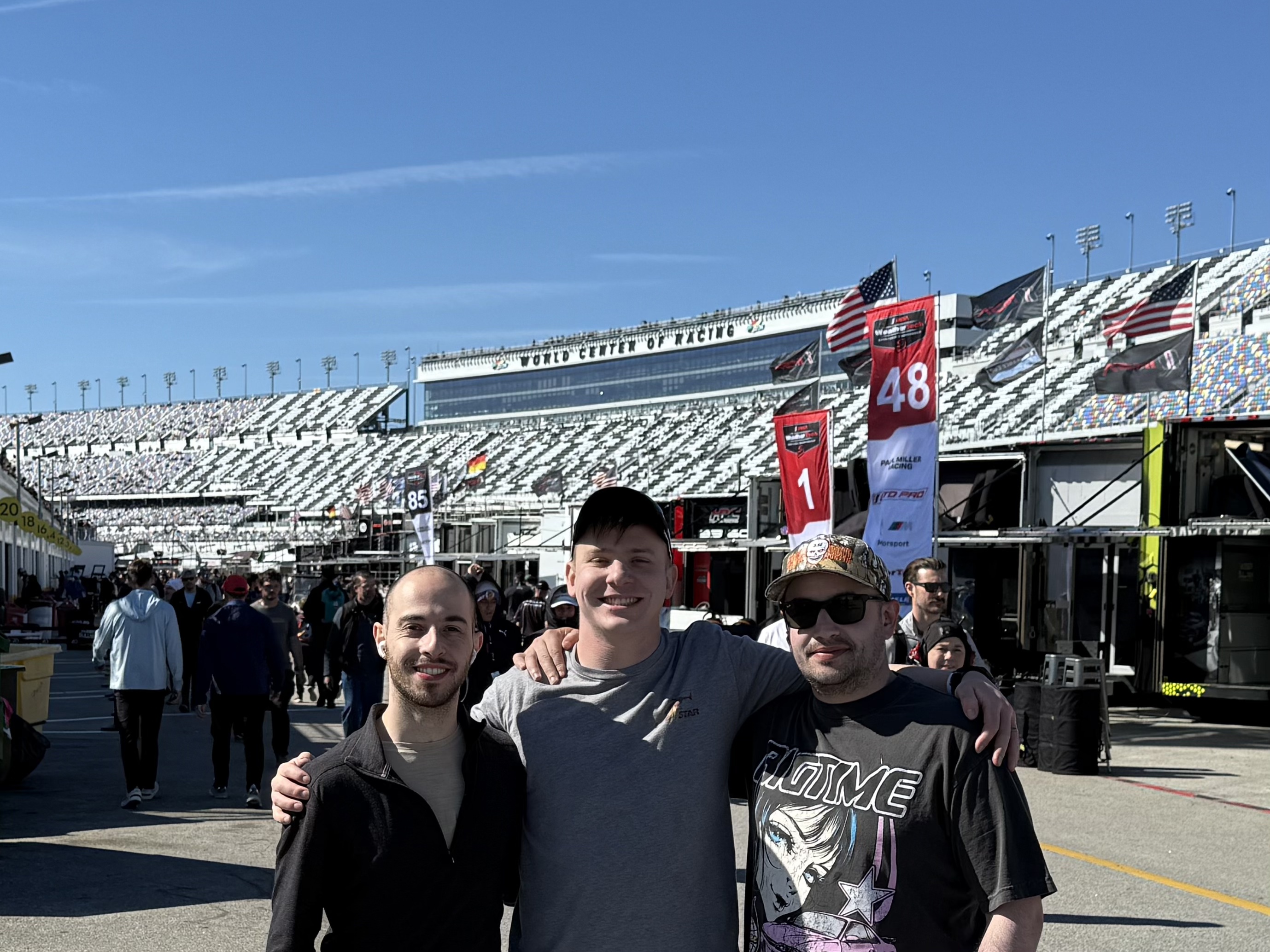 Alejandro, Elliot, and myself (left to right) on the final day of Rolex 24 at Daytona, disheveled after camping in a small tent for 4 days . Road tripped from Minnesota to experience this mega race.